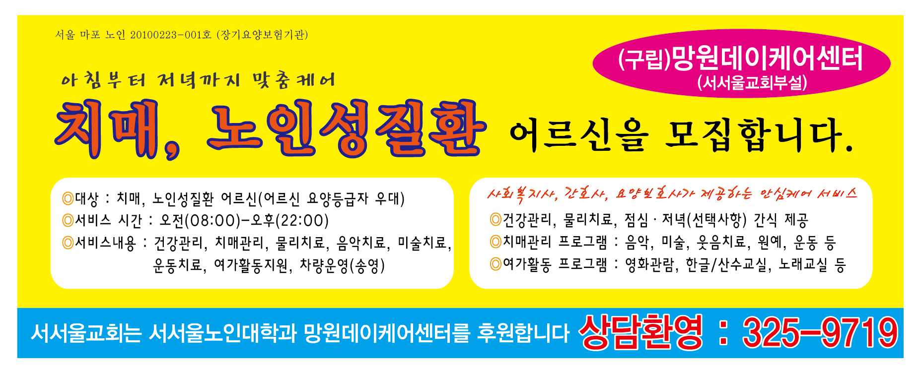 서서울노인대학.맞춤케어.요양등급자.웃음치료.원예.영화관람.한글.산수교실.노래교실.노인장기요양보험.치매.노인성질환.건강관리.물리치료.음악치료.미술치료.운동치료.여가활동광고 : 100BW 애드빈스*마을버스광고.시내버스광고.버스쉘터*정류장광고.버스음성*지하철음성광고.지하철역사광고.택시광고.택배차광고.전광판*빌보드광고.아파트광고.대형마트*편의점광고.바이럴광고.신문광고*