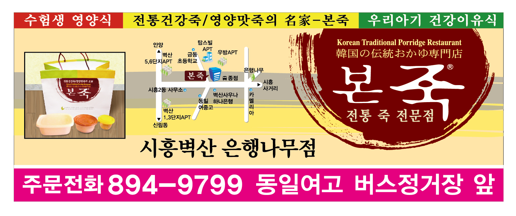 양양맛죽.건강이유식.전통건강죽.본죽.수험생영양식.광고 : 100BW 애드빈스*마을버스광고.시내버스광고.버스쉘터*정류장광고.버스음성*지하철음성광고.지하철역사광고.택시광고.택배차광고.전광판*빌보드광고.아파트광고.대형마트*편의점광고.바이럴광고.신문광고*
